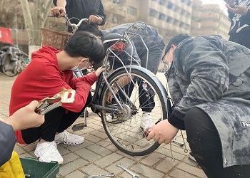活动伊始,志愿者们拉好横幅,备齐工具,为志愿活动做好充分准备。活动开始不久,便有同学前来寻求帮助,经过队员们仔细的讨论探究,成功找到解决办法,并顺利帮助同学解决问题。在接下来的活动过程中,维修的车辆涉及各种类型的问题,这不断地给队员们带来新的挑战,但队员们在部长的带领下相互配合、积极协作,打气、补胎、调试有条不紊的进行着,成功的解决一个又一个问题,随着最后一辆车子维修的完成,活动圆满结束。活动结束后,各位部长为队员们讲解了更多关于修车的知识,队员们积极互动,学习经验。