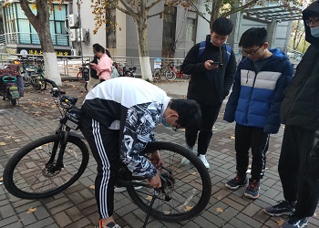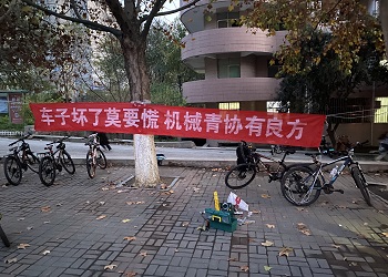 活动伊始,志愿者们拉好横幅,备齐工具,为志愿活动做好充分准备。活动开始不久,便有同学前来寻求帮助,经过队员们仔细的讨论探究,成功找到解决办法,并顺利帮助同学解决问题。在接下来的活动过程中,维修的车辆涉及各种类型的问题,这不断地给队员们带来新的挑战,但队员们在部长的带领下相互配合、积极协作,打气、补胎、调试有条不紊的进行着,成功的解决一个又一个问题,随着最后一辆车子维修的完成,活动圆满结束。活动结束后,各位部长为队员们讲解了更多关于修车的知识,队员们积极互动,学习经验。