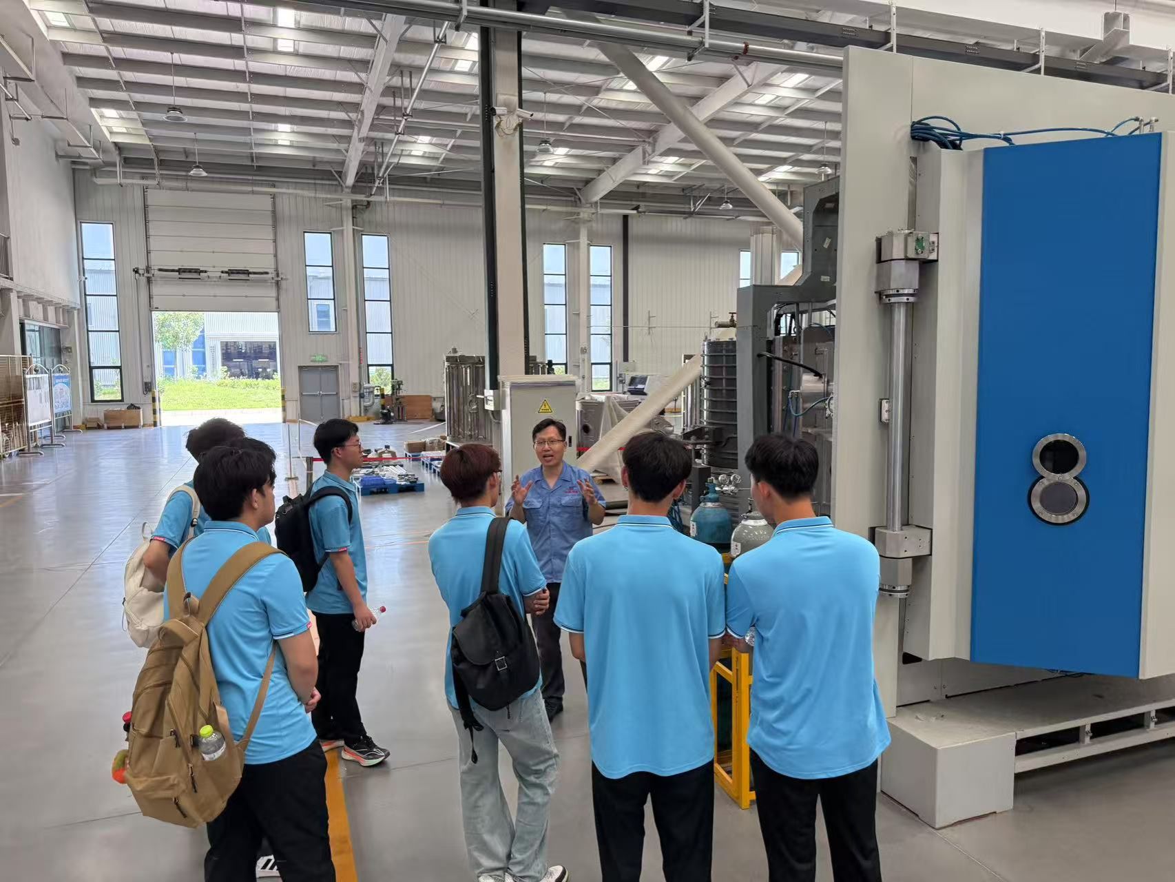 在工程师的带领下,同学们走进真空镀膜生产线,实地观摩真空覆膜加工的运行过程,并学习了参数设置、膜厚检测、故障排查等的标准化流程。在确保安全的前提下,部分同学在工程师指导下尝试了真空腔室维护、镀膜样品制备,切身感受精密制造的严谨性与技术性。实践团成员贾欣然说:“过去只在课本上见过镀膜技术,今天亲手参与操作才发现,每一个微米级的精度控制都凝聚着无数工艺细节。”
