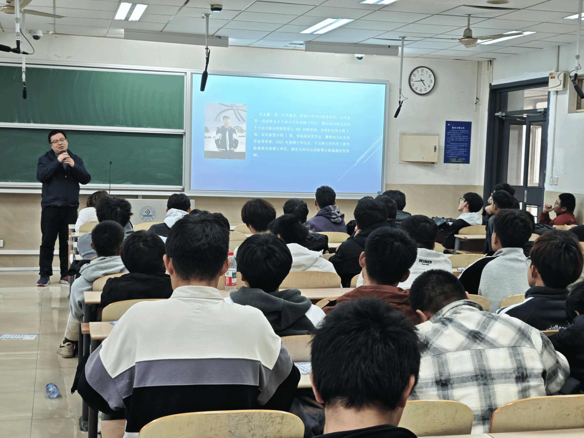 车辆工程专业负责人赵东教授,优秀校友彭金鑫,优秀保研学子张晓欣、刘永鑫开展生涯指导,活动由2025级车辆工程班主任安延涛老师主持。