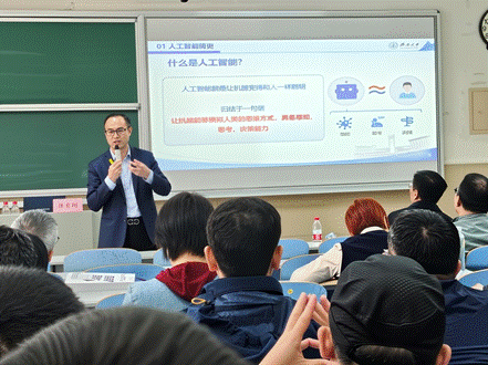 教学情况及AI赋能未来思考五个方面展开系统阐述。他结合国内外典型案例,深入梳理了人工智能发展脉络,全面分析了智能技术在提升教学效率、推动教学模式变革、促进个性化学习等方面带来的重要机遇,同时对工具滥用、能力弱化及数据伦理等现实问题进行了深入剖析。报告还结合学校本科数字教育行动和人工智能交叉课程建设实践,对推进教育教学数字化转型、构建“师-生-机”协同育人新生态提出了具有指导性的思路与路径。